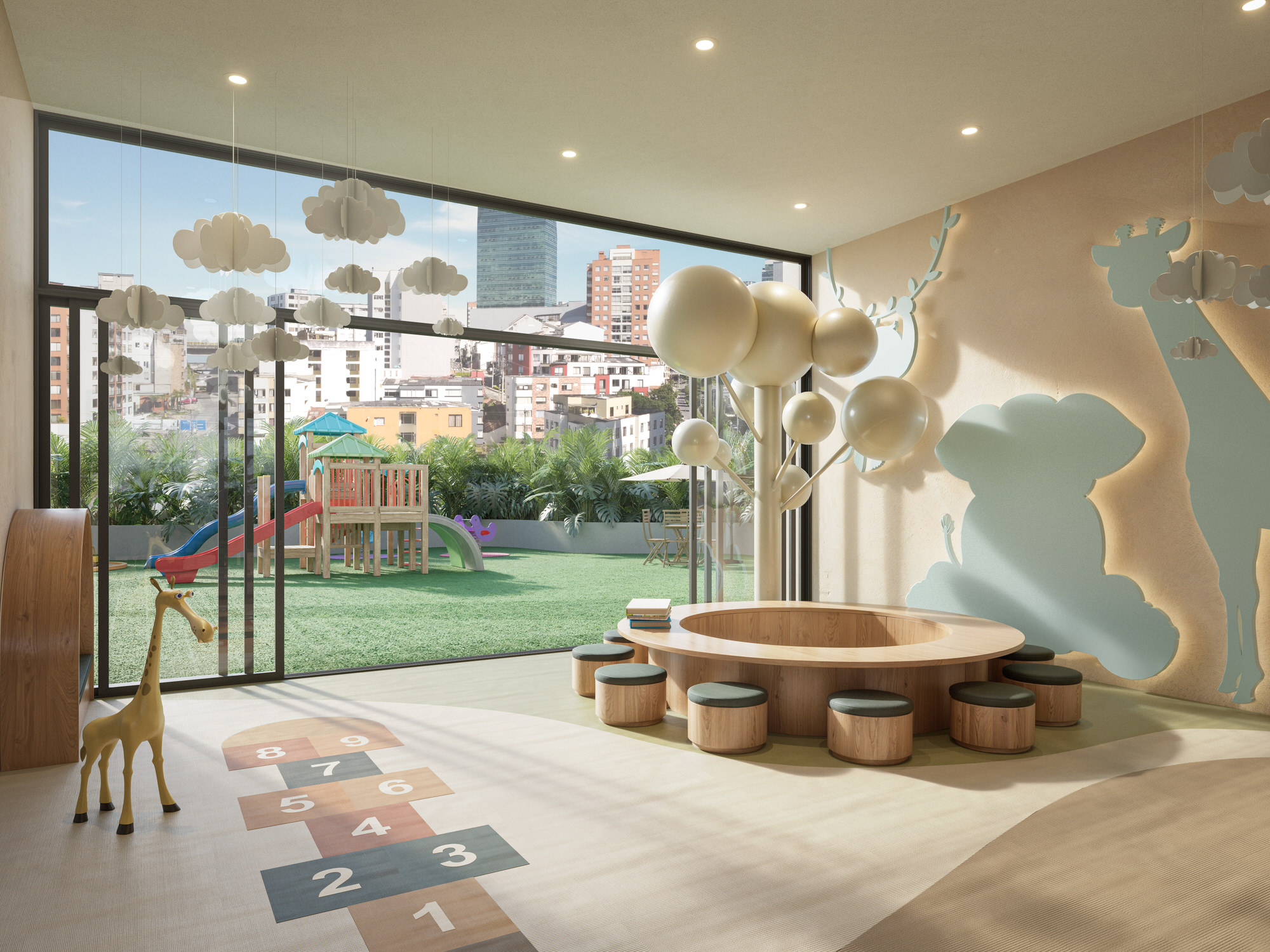 Sus zonas comunes —que incluyen gimnasio, coworking, zonas infantiles, wellness con jacuzzi y una terraza BBQ con vistas únicas— están diseñadas para responder a un estilo de vida activo y familiar. Además, el proyecto integra una zona comercial sobre la avenida principal, con restaurantes, cafés y tiendas, que complementan el estilo de vida de sus residentes y se abren a la ciudad.
